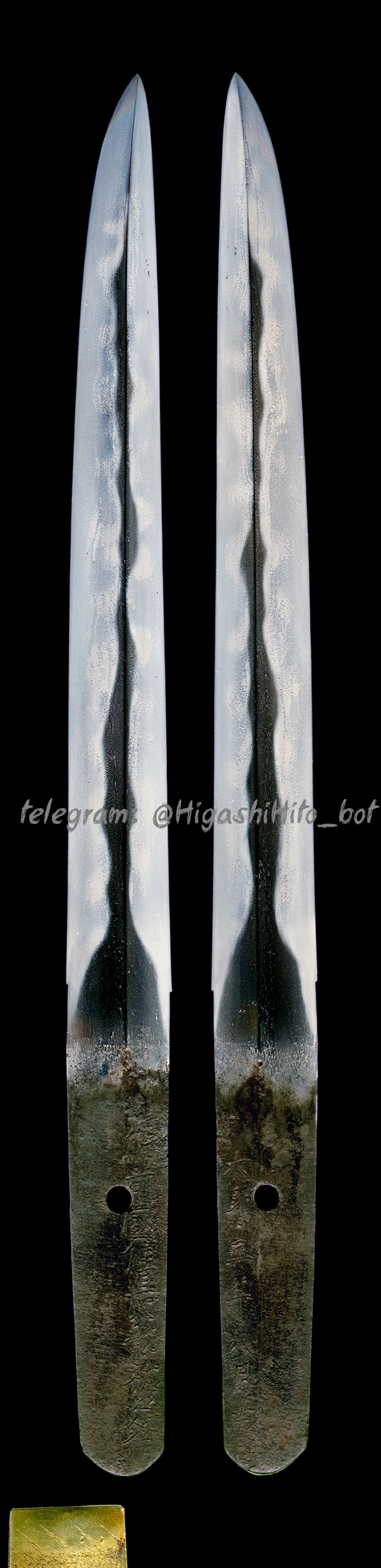 Этот конкретный лезвие отображает сильные итам-хада, тонкую джи-ни, и активный chikei. Хамон показывает открытый Gunome, смешанный с маленькими Gunome, заостренными элементами, Ashi, Y, Coarse Nie, Sunagashi, Kinsuji и Tobiyaki, что приводит к эффекту, подобному Хатацуре. И ковена, и отпуск интенсивны, с ярким и чистым ниигучи - что делает эту работу исключительной работой среди его творчества. Каллиграфический стиль подписи смелый и энергичный, а патина танга, разработанная более пяти веков, действительно превосходна, и очевидно, что этот танто и косира был ценит и хранится в тайне в течение многих поколений.