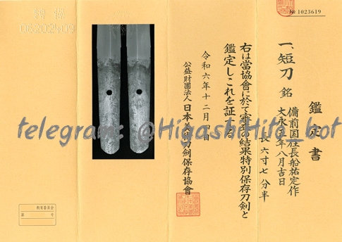 Этот риба-зукури Тант, в то время как отсутствует конкретный зокуми (общее название), демонстрирует отличительные черты Йошамон-Но-Дж Сукесада, одного из самых знаменитых смит среди тех, кто упоминается как «Эйш Бизен». Работа носит типичные характеристики и стиль надписи, приписываемые ему, что делает ее прекрасным примером.