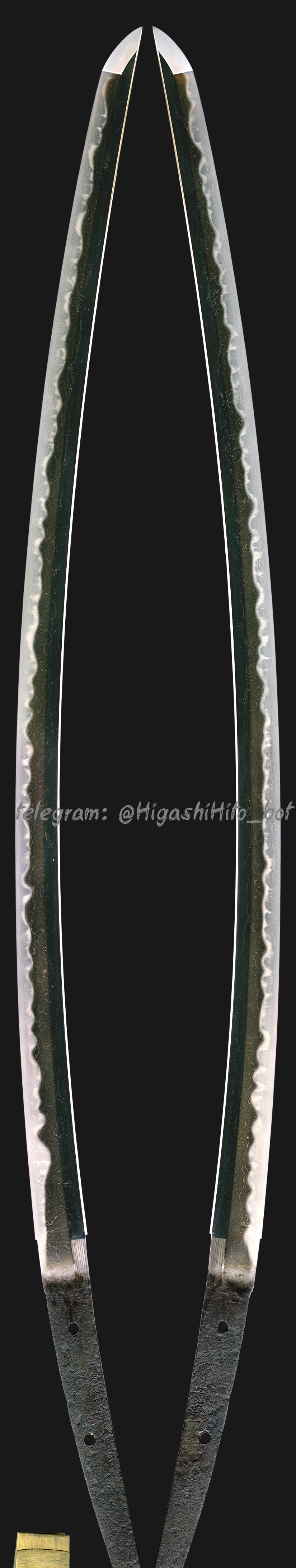 Контекст: В период Муромати формы меча резко изменились: в ранней части тахи были обычными, но в середине периода производство учигатаны процветало. Термин «Ouei Bizen» возникает, потому что многие Bizen Swords The Mear Tears из эпохи Ouei. Стилистически, многие работы Ouei Bizen демонстрируют тенденцию возрождения, вызывая величие школ Ичимонджи и Осафуны периода Камакура. В то время как в тачи периода Камакура обычно есть коси-взори, у Ouei Bizen Tachi периода Муромати часто появляется более глубокая кривизна и добавляя саки-зори. Хамон также переходит от меньших средств и густых узоров более ранних эпох к более крупному ходжи, смешанного с Gunome, ближе к стилям периода Камакура. Примечательные Смиты, активные в этот период, известный как «Ouei Bizen Five Smiths», включают Morimitsu, Yasumitsu, Moromitsu, Tsuneie и Iesuke. Политическая стабильность после воссоединения северных и южных судов побудила сёгунат идеализировать управление воином периода Камакура. В то же время под влиянием Courtly Aesthetics, символизируемой культурой Китайма, мечами приняли стили возрождения. Это привело к ярким произведениям с смелыми волнами, широко открытыми густыми у основания, и Чоджи, смешанный в хамоне, как видно в этом лезвии.