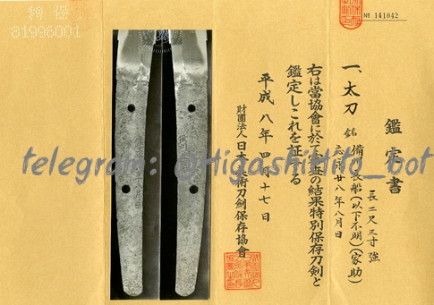 Строительство лезвия: Shinogi-Zukuri Tachi с iori-mune в низком уровне. Тачи немного более широкой на стороне с сильным конусом в сторону точки, в которой изображены высокая определенная кривая возле основания коси-зори (кривизна возле основания) и добавленная саки-зори (кривисть рядом с кончиком) и чудо-кисски (кончик среднего размера), выявляя из-за того, что да, давая тачи элегантный, классический внешний вид. ( Подробное фото лезвия ) Образец ковки: Jigane (стальная поверхность) показывает комбинацию Itame и Mokume Hada, с общим выдающимся зерном. В Хираджи есть размышление о джифу-утсури. Хамон: маленький канальный рисунок начинается низко возле основания, а затем развивается в широкий ходжи, смешанный с Geunome и сложным многослойным. Вся поверхность лезвия охвачена ярким NIOI, а ниои-гучи (граница заливой области) ясная и светящаяся. Аши (ноги) Чоджи излужается в направлении режущей кромки, где они часто пересекаются с помощью Sunagashi (потокоподобные линии) и изолируют вас. Общая окраска хамона свежая и сияющая. Боши: успокаивает чуть ниже линии Йокоте, затем становится нерегулярным в Gunome, поворачиваясь назад, образуя небольшой округлый наконечник ко-мару. Накаго (Тан): Ubu Nakago (неизмененный Tang) имеет глубокую кривизну, а передовая сторона образуется на форме бедра фазанов (кидзимомо). У него есть две марки Mekugi-anana (PEG) и мелкие файлы Katte-Sagari Yasurime. В пятке танга-форма Кури-джири, наклонная вверх на стороне HA, с плоской мунией. На верхней поверхности Shinogi-Ji Tang появляется чтение надписной надписи в скромном размере »(Bish Osafune), а на обратной стороне-дату (на 8-м месяце, Ouei 28-й). Из разборчивого радикала U-Kanmuri в персонаже он идентифицируется как работа Iesuke.
